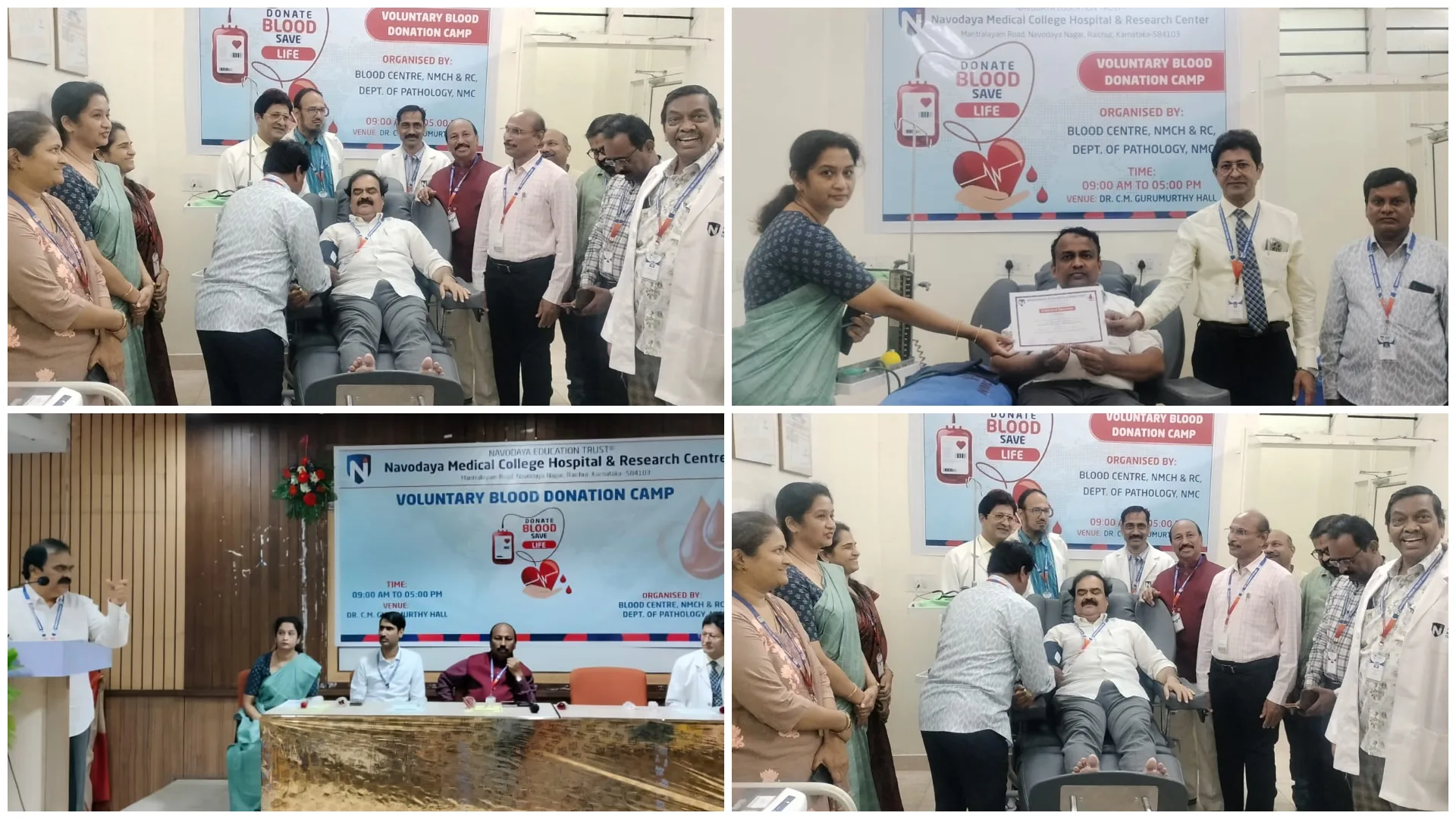 To commemorate World Blood Donor Day, a Voluntary blood donation camp was organized from 9.00AM to 5.00PM by the Blood Centre, NMCH&RC, Department of Pathology, Navodaya Medical College, Raichur, at Dr. C.M. Gurumurthy Hall, NMCH&RC on 30th June 2025.